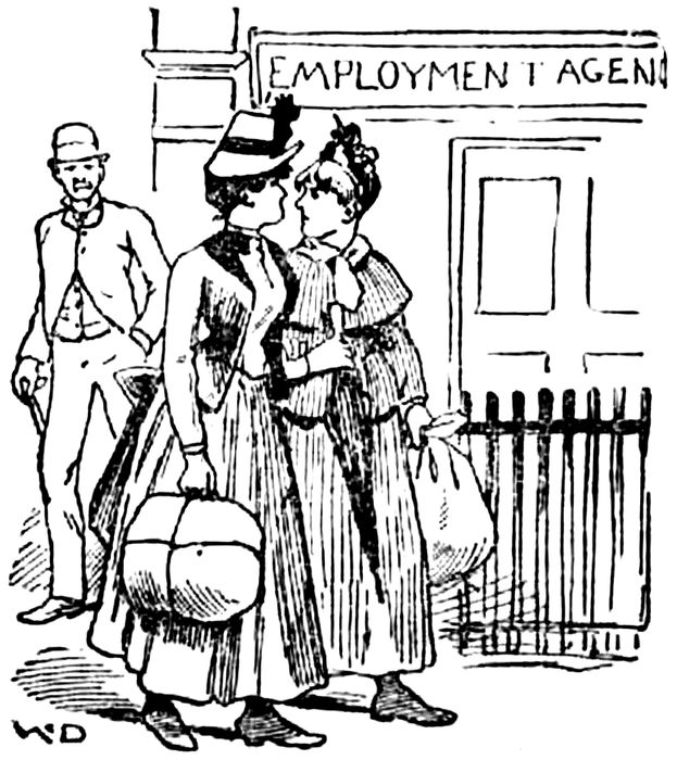 On the following morning, about 10:30, I made my appearance at the agency. Some eight or ten girls were in the room and the man who had pocketed my fee on the previous afternoon still adorned the throne back of the desk. No one said good-morning, or anything else for that matter, so I quietly slid onto a chair near the door. The girls were all comfortably dressed, and looked as if they had enjoyed hearty breakfasts. All sat silent, with a dreamy expression on their faces, except two who stood 105by the window watching the passing throng and conversing in whispers with one another. I wanted to be with or near them, so that I might hear what was said. After waiting for some time I decided to awake the man to the fact that I wanted work, not a rest. “Have you no place to send me this morning?” “No; but I advertised you in the paper,” and he handed me the Tribune of October 25 and pointed out the following notice: “Nurse, &c.—By excellent, very neat English girl as nurse and seamstress, chambermaid and waitress, or parlor maid. Call at 69 4th ave.; no cards answered.” I choked down a laugh as I read myself advertised in this manner, and wondered what my role would be the next time. I began to hope some one would soon call for the excellent girl, but when an aged gentleman entered I wished just as fervently that he was not after me. I was enjoying my position too much, and I fear I could not restrain my gravity if any one began to question me. Poor old gentleman! He looked around helplessly, as if he was at a loss to know what to do. The agent did not leave him long in doubt. “You want a girl, sir?” “Yes; my wife read an advertisement in the Tribune this morning, and she sent me here to see the girl.” “Yes, yes, excellent girl, sir, come right back here,” opening the gates and giving the gentleman a chair behind the high counter. “You come here, Sally Lees,” indicating a chair beside the visitor for me. I sat down with an inward chuckle and the agent leaned over the back of a chair. The visitor eyed me nervously, and after clearing his throat several times and making vain attempts at a beginning, he said: “You are the girl who wants work?” And after I answered in the affirmative, he said: “Of course you know 106how to do all these things—you know what is required of a girl?” “Oh, yes, I know,” I answered confidently. “Yes—well, how much do you want a month?” “Oh, anything,” I answered, looking to the agent for aid. He understood the look, for he began hurriedly: “Fourteen dollars a month, sir. She is an excellent girl, good, neat, quick and of an amiable disposition.” I was astonished at his knowledge of my good qualities, but I maintained a lofty silence. “Yes, yes,” the visitor said, musingly. “My wife only pays ten dollars a month, and then if the girl is all right she is willing to pay more, you know. I really couldn’t, you know——” “We have no ten-dollar-girls here, sir,” said the agent with dignity; “you can’t get an honest, neat, and respectable girl for that amount.” “H’m, yes; well, this girl has good references, I suppose?” “Oh, yes; I know all about her,” said the agent, briskly and confidently. “She is an excellent girl, and I can give you the best personal reference—the best of references.” Here I was, unknown to the agent. So far as he knew, I might be a confidence woman, a thief, or everything wicked, and yet the agent was vowing that he had good personal references. “Well, I live in Bloomfield, N. J., and there are only four in the family. Of course you are a good washer and ironer?” he said, turning to me. Before I had time to assure him of my wonderful skill in that line the agent interposed: “This is not the girl you want. No, sir, this girl won’t do general housework. This is the girl you are after,” bringing up another. “She does general housework,” and he went on with a long list of her virtues, which were similar to those he had professed to find 107in me. The visitor got very nervous and began to insist that he could not take a girl unless his wife saw her first. Then the agent, when he found it impossible to make him take a girl, tried to induce the gentleman to join the bureau. “It will only cost you $2 for the use of the bureau for a month,” he urged, but the visitor began to get more nervous and to make his way to the door. I thought he was frightened because it was an agency, and it amused me to hear how earnestly he pleaded that really he dare not employ a girl without his wife’s consent. After the escape of the visitor we all resumed our former positions and waited for another visitor. It came in the shape of a red-haired Irish girl. “Well, you are back again?” was the greeting given her. “Yes. That woman was horrible. She and her husband fought all the time, and the cook carried tales to the mistress. Sure and I wouldn’t live at such a place. A splendid laundress, with a good ‘karacter,’ don’t need to stay in such places, I told them. The lady of the house made me wash every other day; then she wanted me to be dressed like a lady, sure, and wear a cap while I was at work. Sure and it’s no good laundress who can be dressed up while at work, so I left her.” The storm had scarcely passed when another girl with fiery locks entered. She had a good face and a bright one, and I watched her closely. “So you are back, too. You are troublesome,” said the agent. Her eyes flashed as she replied: “Oh, I’m troublesome, am I? Well, you can take a poor girl’s money, anyway, and then you tell her she’s troublesome. It wasn’t troublesome when you took my money; and where is the position? I have walked all over the city, wearing out my shoes and spending my money in car-fare. Now, is this how you treat poor girls?” 108“I did not mean anything by saying you were troublesome. That was only my fun,” the agent tried to explain; and